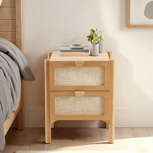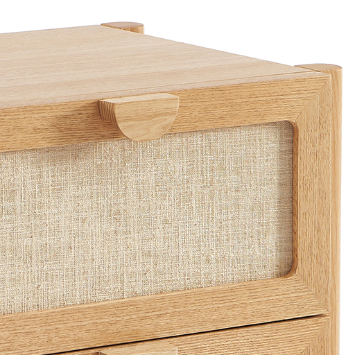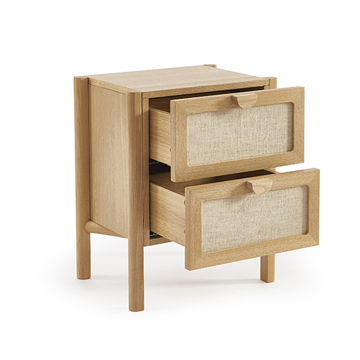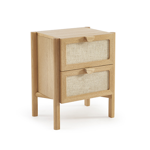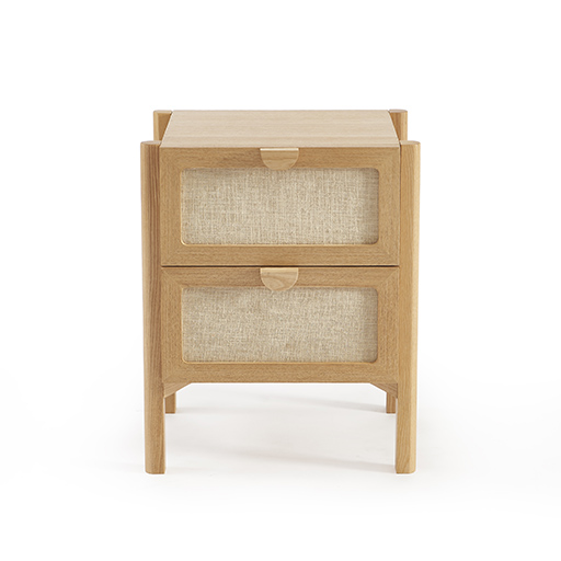 This bedside table highlights the linen texture applied to its two drawer fronts. Its compact format offers clear, practical storage for everyday items. The understated oak framing emphasises the drawers’ simplicity, while the rounded-leg base, shared across the collection, adds a soft and balanced presence. Soft-closing drawers ensure a smooth and quiet experience.