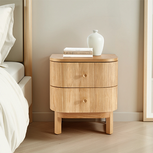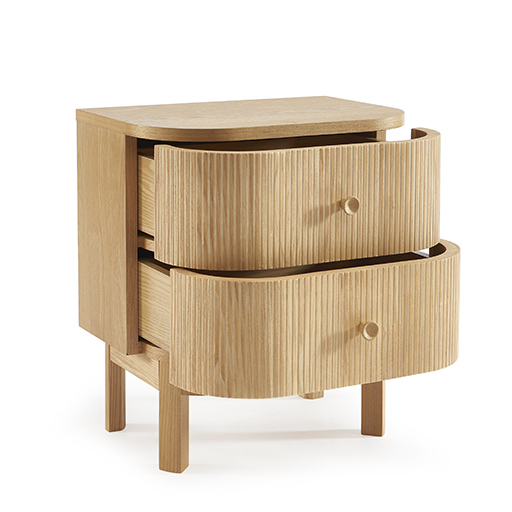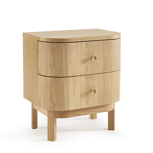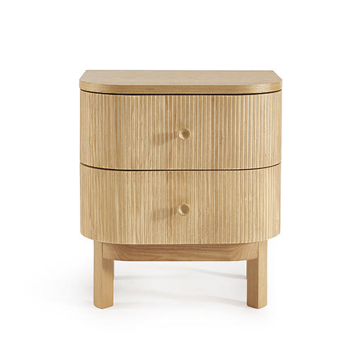 Ce chevet transpose les cannelures verticales dans un format compact pensé pour la chambre. Les deux tiroirs affichent le même travail de texture, créant un rythme apaisant. Le piètement surélevé allège le meuble, les poignées rondes en bois prolongent la matière naturelle. Les angles adoucis renforcent sa présence discrète.
