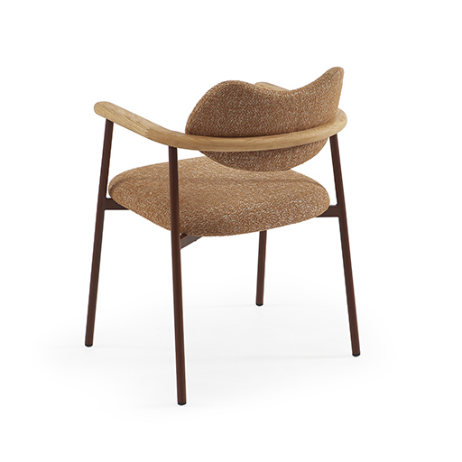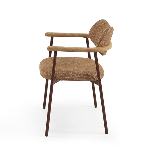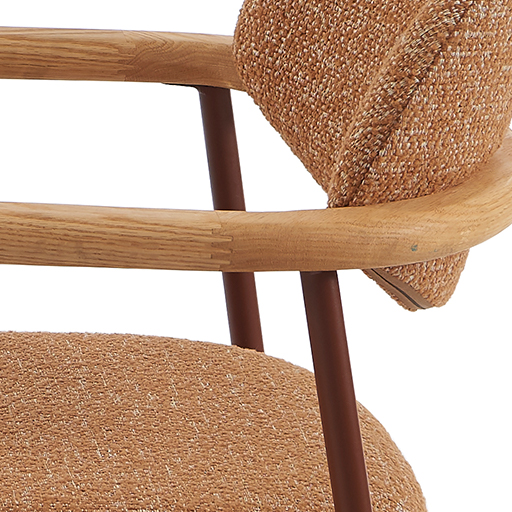 The ULIA chair brings timeless elegance to any space. Its gently curved backrest naturally follows the body’s contours, creating a quiet cocoon of comfort. Light wood armrests add warmth and structure, flowing seamlessly from the seat in an ergonomic, refined gesture. The generously padded seat and terracotta boucle fabric bring a warm, textured presence—perfect for gathering around a dining table or creating an inviting reading nook. The burgundy metal base anchors the design with strength while maintaining a beautifully light visual presence.