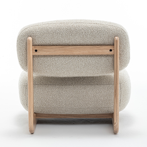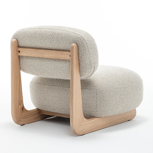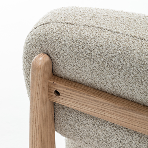The beige bouclé fabric brings a calm, tactile warmth, while the continuous sculpted wooden frame anchors the piece with character and elegance