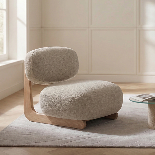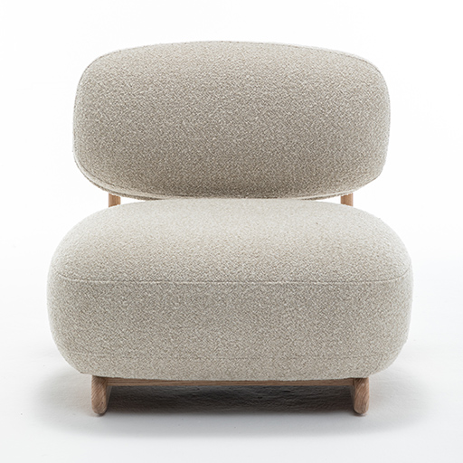 The BLISS armchair expresses a soft presence through generous volumes and a finely balanced design. Its rounded backrest, slightly detached from the seat, appears to float above it, creating a subtle interplay of lines. The generously layered seat enhances the sense of deep comfort while shaping a low, inviting silhouette.