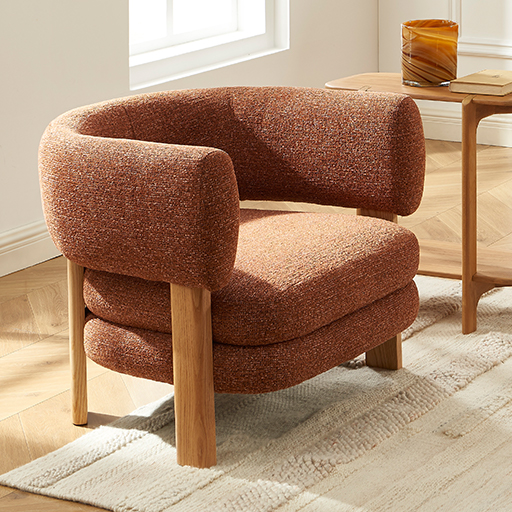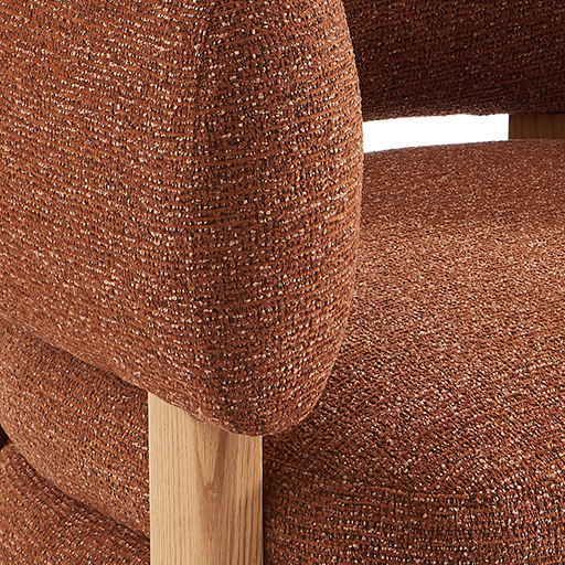 The CURVE armchair combines generous volumes with an enveloping silhouette. Its continuous, rounded backrest wraps around the seat, creating an immediate sense of comfort and support. The terracotta textured fabric brings depth and warmth, while the natural wood legs structure the piece with balance and character.