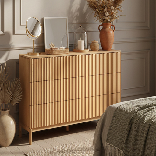 The NISA six-drawer chest embodies functional minimalism. Its fluted fronts, crafted from natural wood, deliver rich tactile and visual texture. Each drawer glides smoothly, revealing generous, thoughtfully designed storage space. Designed to fit seamlessly into a bedroom, living room, or hallway, it balances understated elegance with everyday comfort.