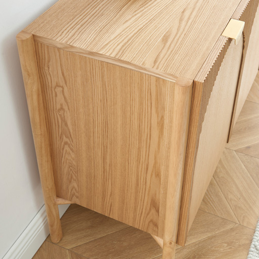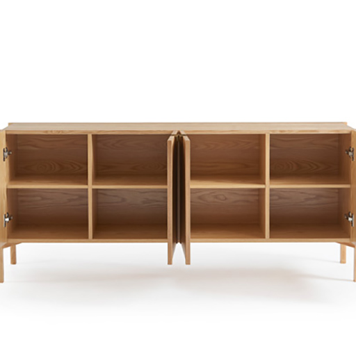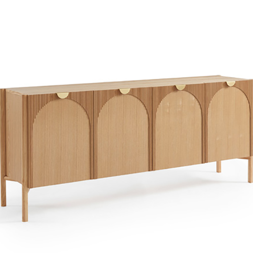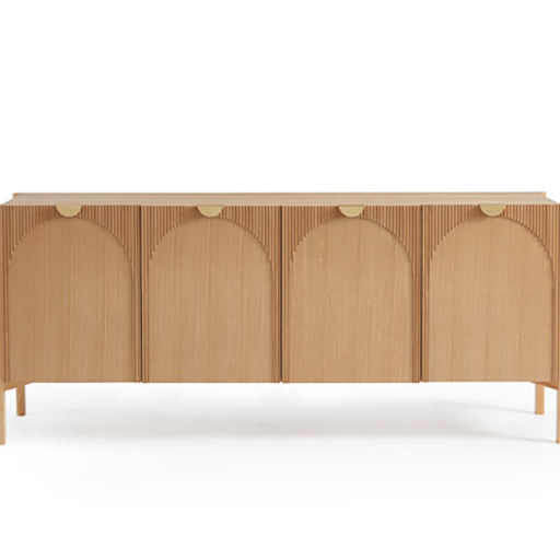 This four-door sideboard showcases the full continuity of the collection’s signature arc, unfolding across the entire front to create a sculptural rhythm. Inside, generous storage compartments keep everything neatly organised. The slim, elevated base lightens the overall silhouette and enhances the elegance of the piece within the room.