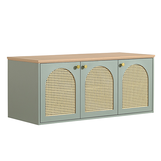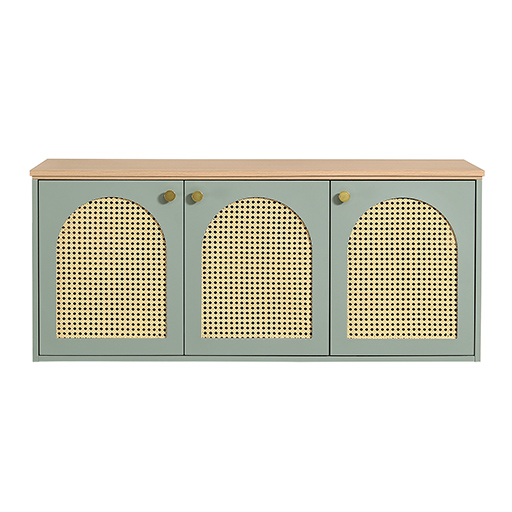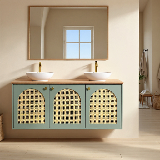 In its sage-green finish, this vanity unit takes on a calming presence. The botanical tone brings a sense of gentle serenity, enriched by the texture of natural cane. The three arched fronts introduce a harmonious rhythm, while the light-wood top naturally accommodates two countertop basins. Behind the three doors, practical storage makes it easy to organise everyday bathroom essentials.