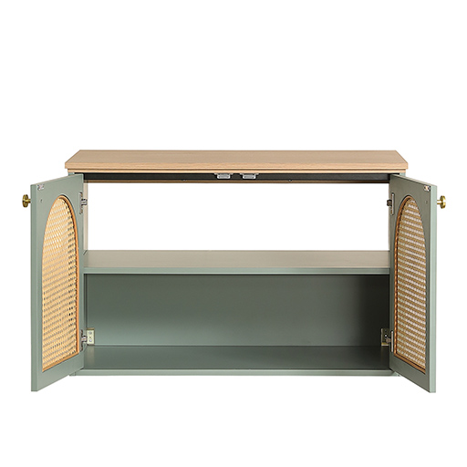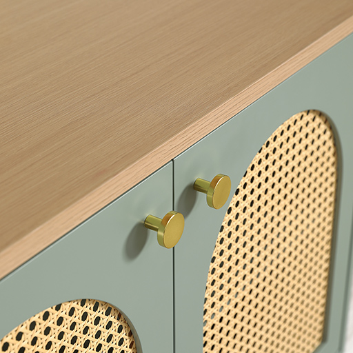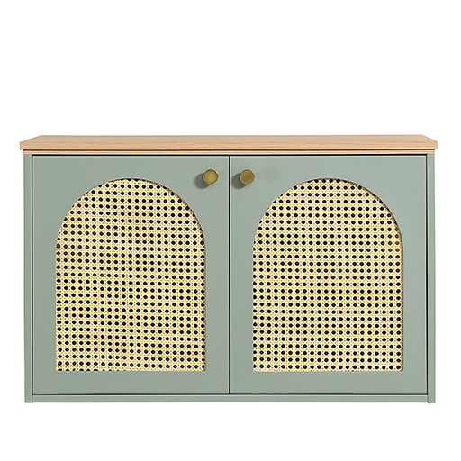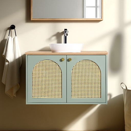 In its sage-green finish, this vanity unit takes on a calming presence. The botanical tone brings a sense of gentle serenity, enriched by the texture of natural cane. The two arched fronts introduce a harmonious rhythm, while the light-wood top naturally accommodates a countertop basin. Behind the two doors, practical storage makes it easy to organise everyday bathroom essentials.