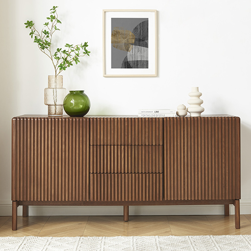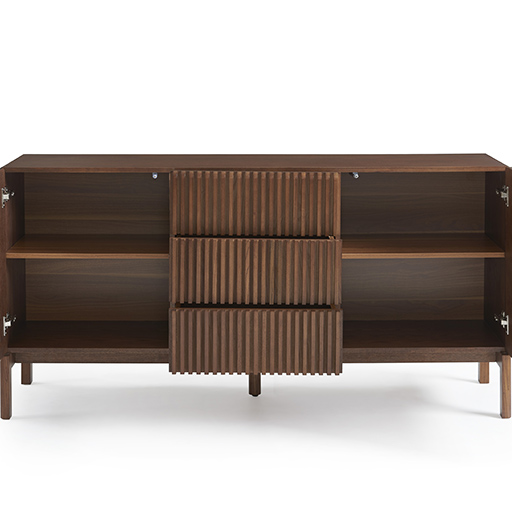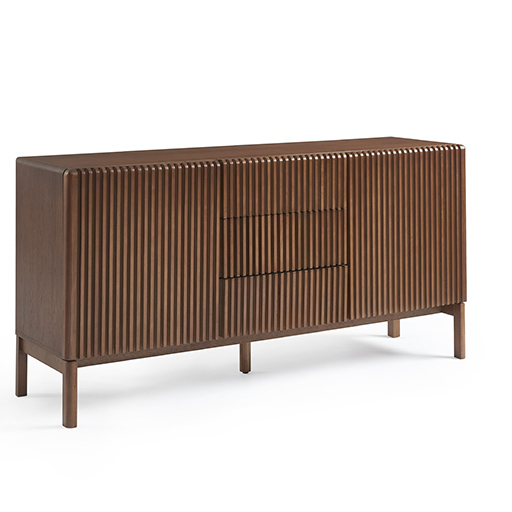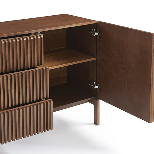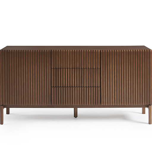 Ce buffet exprime l’identité NISA par ses façades cannelées qui créent un jeu visuel et tactile marqué. Les portes et tiroirs s’organisent pour répondre à différents besoins de rangement, alliant discrétion et accessibilité. Les proportions travaillées affirment sa présence dans l’espace tout en conservant un équilibre harmonieux.