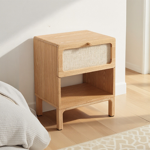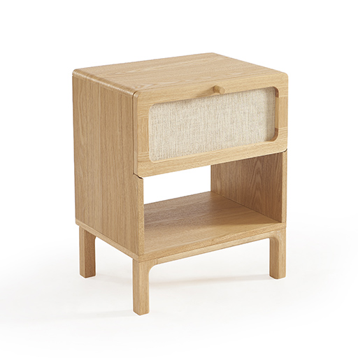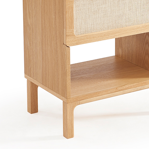 Ce chevet incarne l’esprit MURMUR dans sa pluralité fonctionnelle parfaitement équilibrée. Le tiroir supérieur orné de lin offre un rangement discret pour les objets intimes, tandis que la niche ouverte accueille naturellement les essentiels de la nuit. Cette organisation verticale optimise l’espace de chevet tout en créant un rythme visuel apaisant.