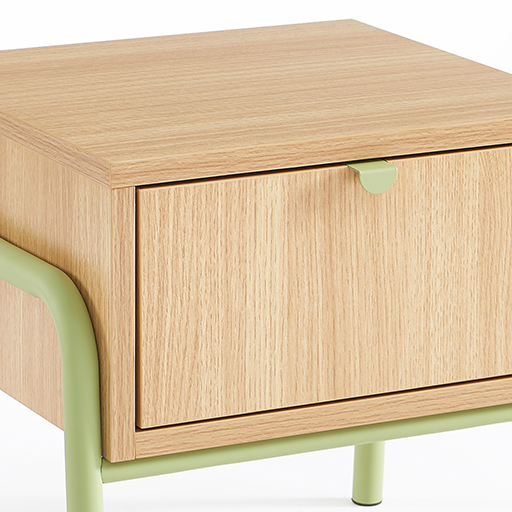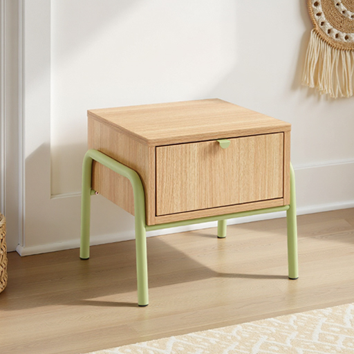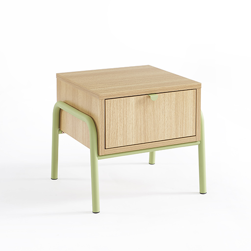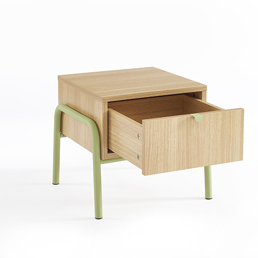 Cette version tiroir ajoute une dimension de rangement discret au chevet. La poignée ronde verte facilite la préhension enfantine, tandis que le tiroir coulissant en douceur permet de dissimuler les petits secrets et trésors. Cette approche éducative du rangement personnel accompagne le développement de l’intimité et de l’organisation.