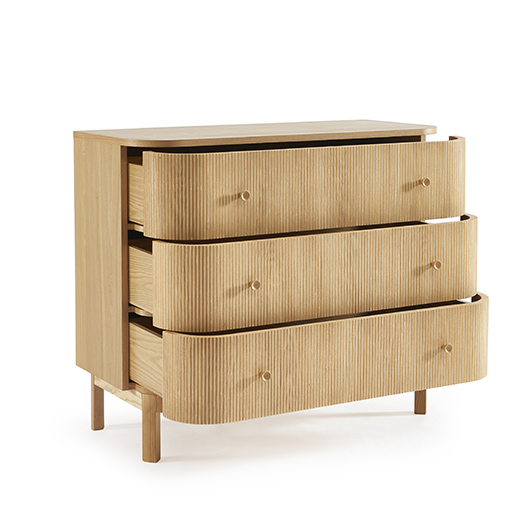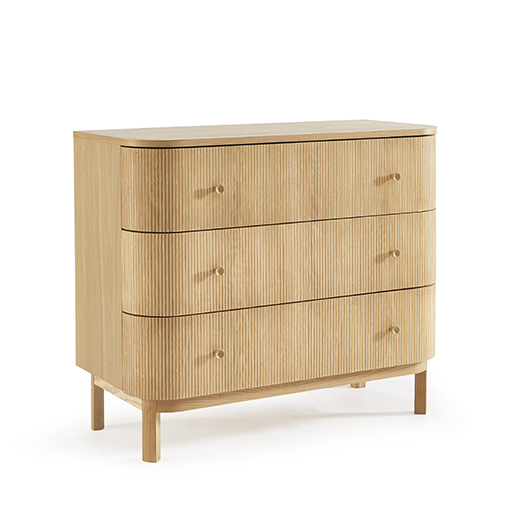 Cette commode trois tiroirs affirme l’identité de la gamme par ses cannelures verticales qui structurent toute la façade. Les proportions généreuses s’intègrent naturellement dans la chambre, tandis que le piètement en retrait allège l’ensemble et met en valeur le volume principal.