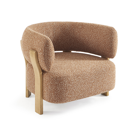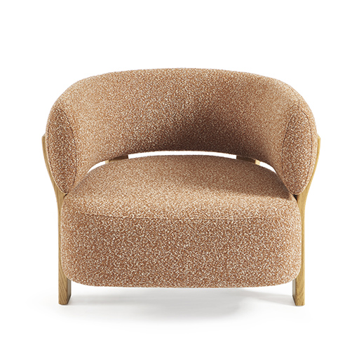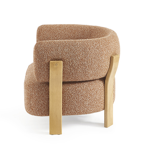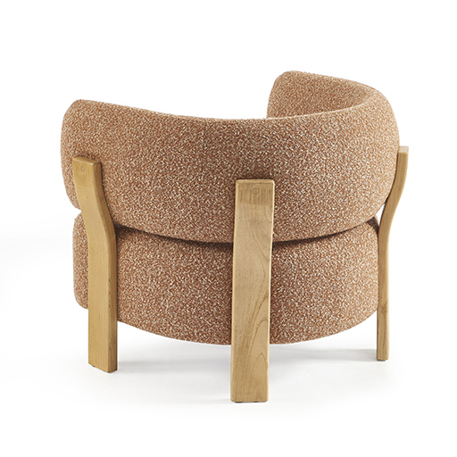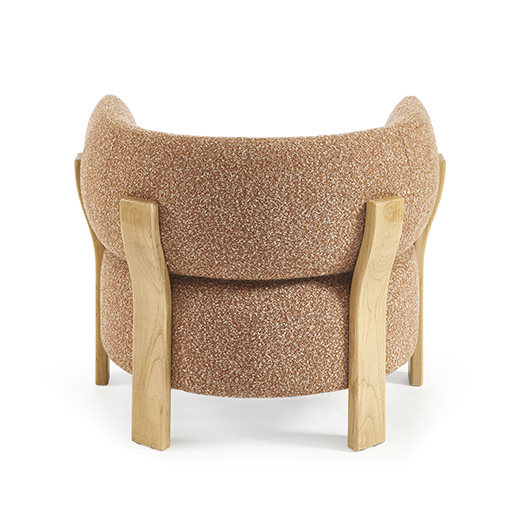 La structure en bois, dont les pieds viennent prolonger naturellement la courbe du dossier, dessine une ligne fluide et sculpturale qui accompagne le volume avec élégance.